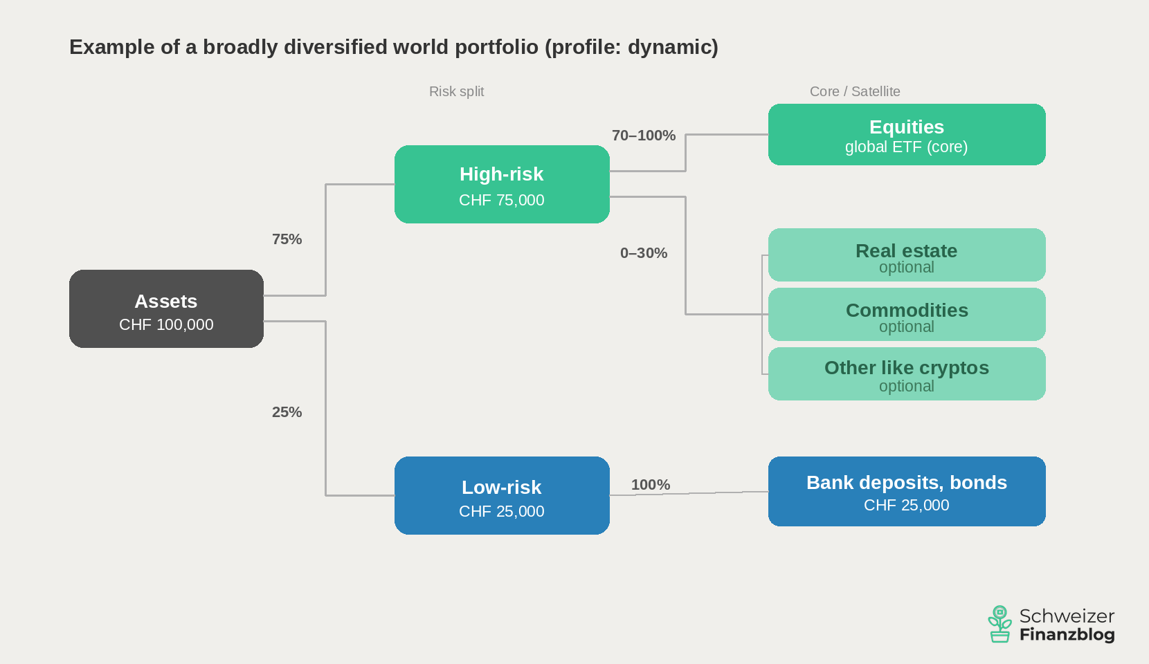 Let’s assume fictitious fixed assets of CHF 100,000 – your nest egg is already secured. You have a regular income and have your running costs under control. Five typical breakdowns for your assets: