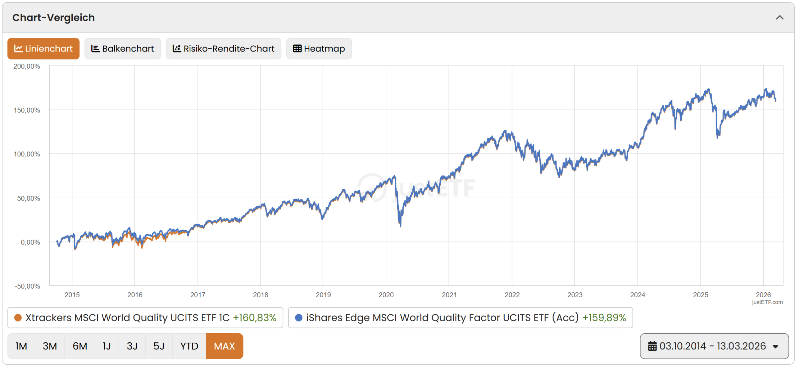 The quality factor offers one of the strongest long-term premiums in this comparison: since 1994, the MSCI World Quality has outperformed the overall market by 3.15 percentage points annually. It is particularly noteworthy that quality stocks tend to be more resilient than the broad market in times of crisis thanks to their solid balance sheets and stable earnings. The premium is well documented scientifically and is considered more robust than the value or size factor, for example.
