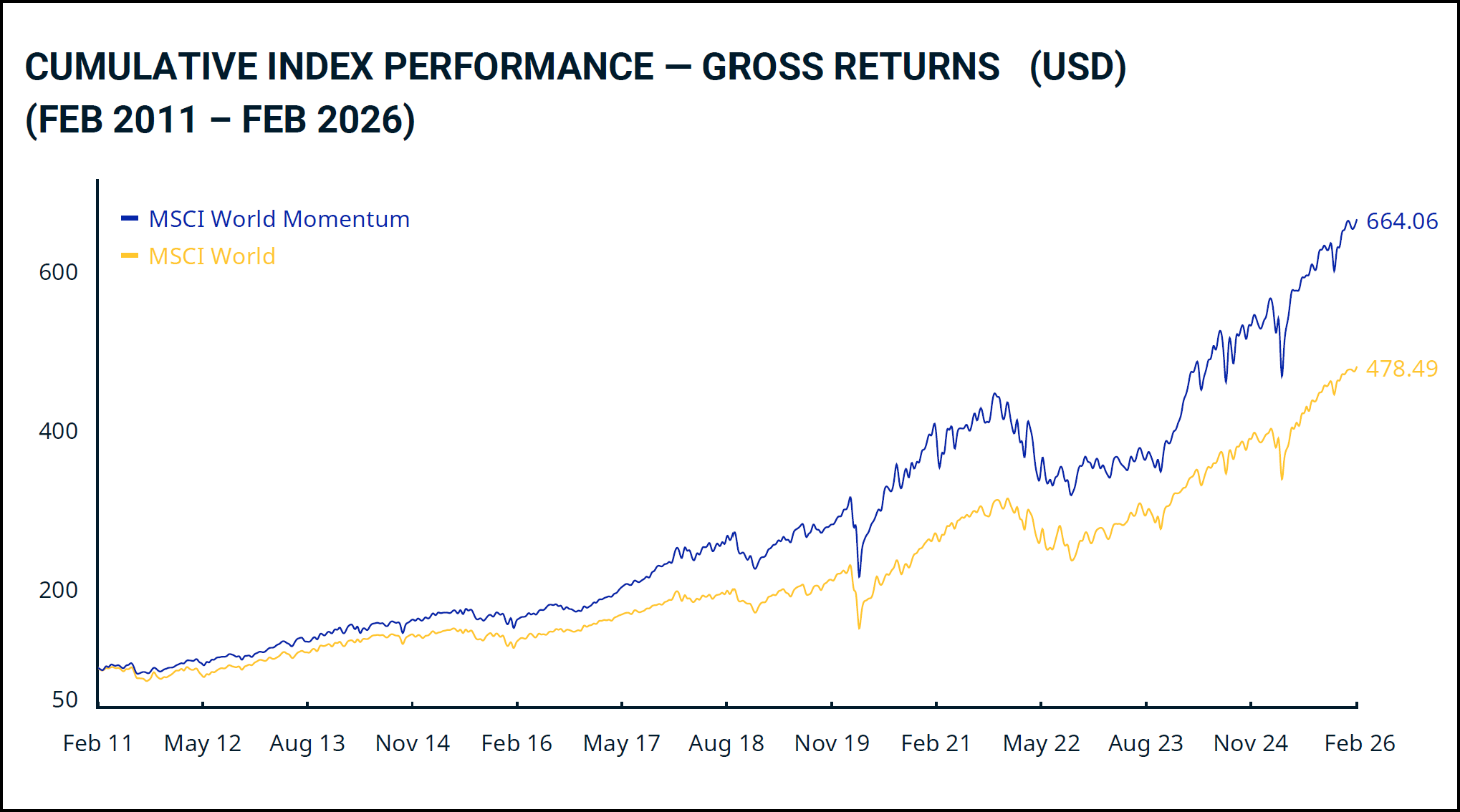 The data speaks for itself: over the last 15 years, the MSCI World Momentum has clearly outperformed the market-neutral MSCI World with 664 vs. 478 points. In a long-term comparison since 1994, the momentum factor also impresses with an annualized return of 11.69% compared to 8.90% for the MSCI World – an excess return of 2.79 percentage points over around 32 years. This makes the momentum factor one of the best scientifically proven and most convincing factors in practice.