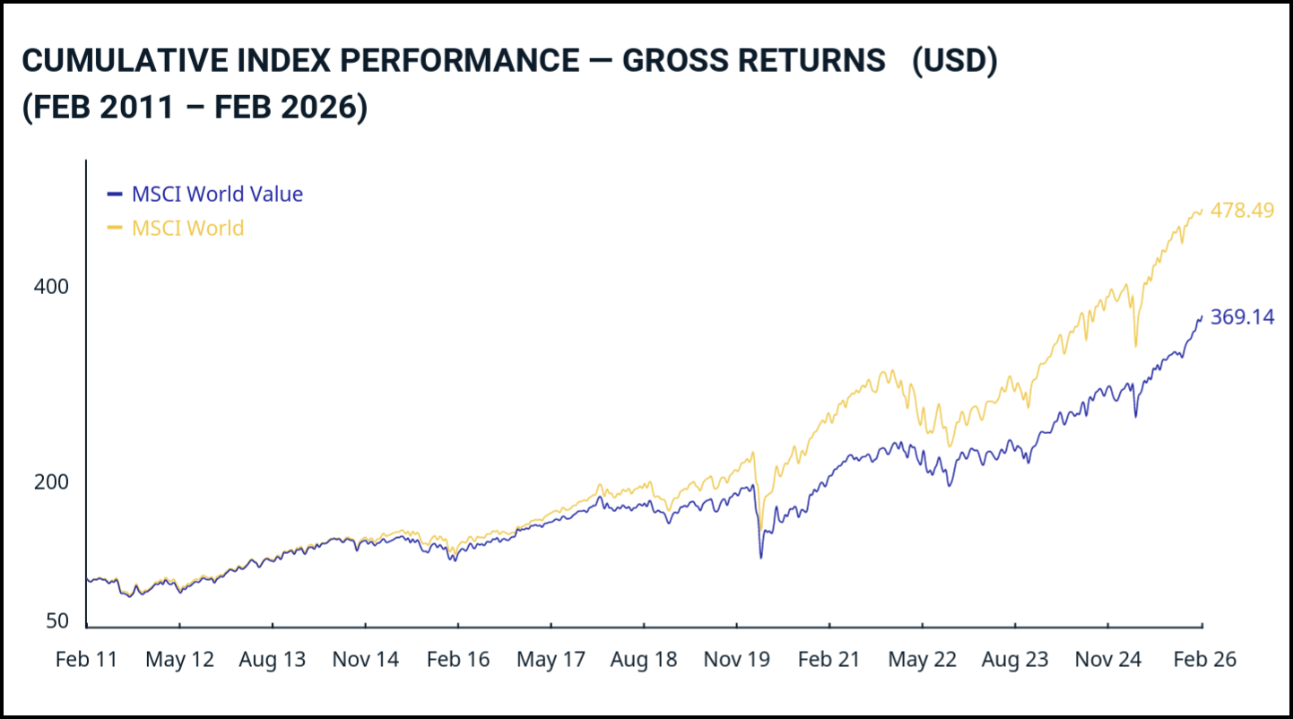 The data paints a sobering picture: Over the last 15 years, the MSCI World Value has significantly underperformed the market-neutral MSCI World – driven by the dominance of US technology stocks. A long-term comparison since 1974 shows a marginal excess return of 0.38 percentage points (11.61% vs. 11.23%), but this is before costs and taxes. If the higher product costs and the additional tax burden from dividend distributions are deducted, the premium largely disappears – which is why we remain skeptical about the value factor.