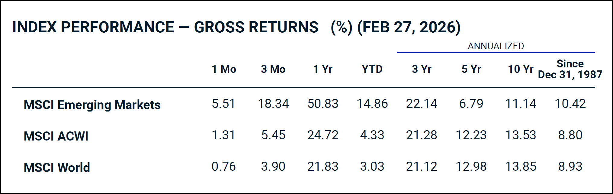The largest position in the MSCI Emerging Markets as at 27.2.2026 is the Asian chip giant Taiwan Semiconductor – a global corporation that is considered an emerging market stock by MSCI solely due to its domicile. Index competitor FTSE, on the other hand, already classifies Taiwan as a developed market.