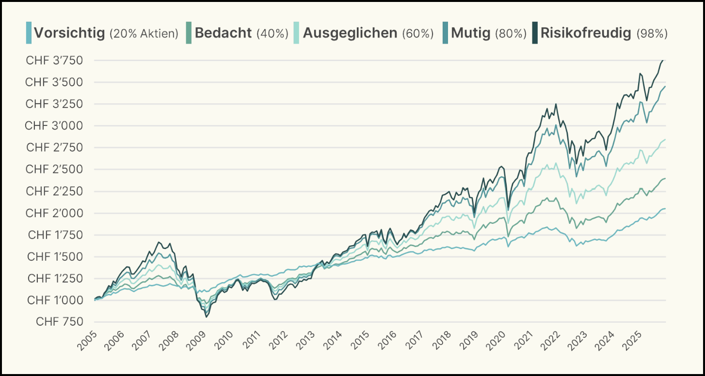 Demgegenüber bleibt für Anlegerinnen und Anleger, welche besonderen Wert auf ein umfassendes Produkteangebot und/oderdie geringstmöglichen Kosten das «Do it yourself»-Portfolio erste Wahl. Hierfür benötigst eine geeignete Handelsplattform: Auf unserer Empfehlungsseite findest du eine Auswahl von uns getesteter Online-Broker inkl. Startguthaben (vgl. auch unsere Artikelserie Lerne investieren – in acht Lektionen).